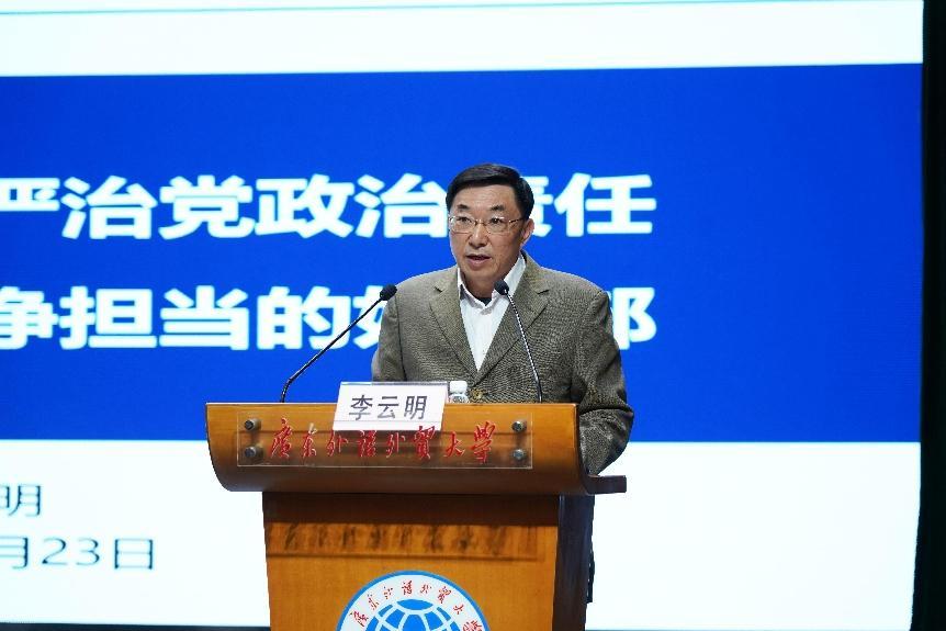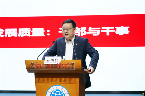 在报告中,石佑启结合党的二十大精神和广东高质量发展大会精神,深刻分析了当前我校全面实施“十四五”规划和全力“冲一流”的新任务、新挑战。他指出,必须深刻把握实施科教兴国战略、强化现代化建设人才支撑的重大意义,必须以质的提升开启新一轮发展和赶超,必须提升办学治校的核心竞争力。石佑启提出,作为学校中层领导干部,需要拼搏进取、守正创新,走出一条以继承发展为出发点,以团结奋斗为关键点,以改革创新为着力点的高质量发展之路。石佑启对新一届中层领导干部提出了五点新要求:一是要讲学习、强能力,主动谋划开新局。二是要讲担当、善作为,铆足干劲“冲一流”。三是要讲团结、聚合力,一心一意谋发展。四是要讲实干、重实绩,久久为功抓落实。五是要讲廉洁、守纪律,牢记安全保底线。