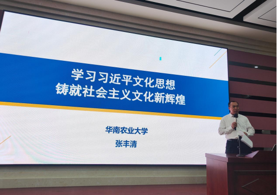12月7日下午,学校党委举办第一期党员素质提升大讲堂,邀请华南农业大学马克思主义学院院长张丰清教授作“习近平文化思想”专题讲座,学校200余名师生党员参加学习。讲座由党委组织部副处级组织员、机关党委副书记沈冬苗主持。