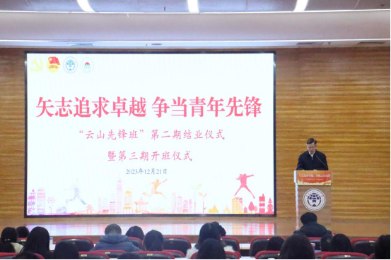 12月21日下午,“云山先锋班”第二期结业暨第三期开班仪式顺利举行。校党委常委、副校长何传添,校党委常委、组织部部长、党校办公室主任黄秀娟,学生工作部部长国佳,以及各相关职能部门和学院领导出席本次会议。仪式由校团委(挂职)副书记赵继伟主持。