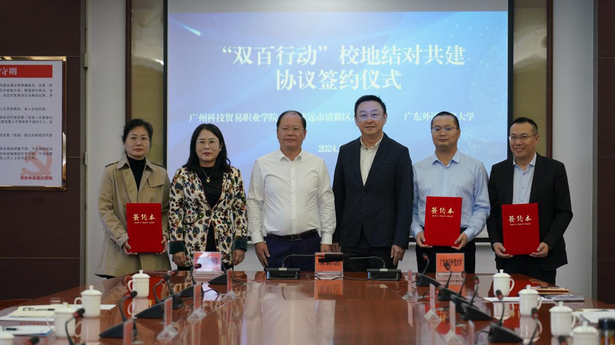 11月21日,由我校牵头、广州科技贸易职业学院组团的“双百行动”(百校联百县助力“百千万工程”行动)第二批结对共建签约仪式在清新区举行,学校党委副书记唐锐、广州科技贸易职业学院副校长丁霞、清新区委书记刘建俊等出席签约仪式。