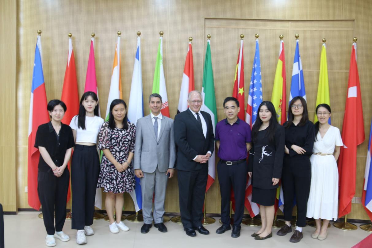 陈云良(右四)与国际法学会执行董事夏均博及学生代表在国际组织实验室合影